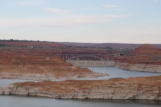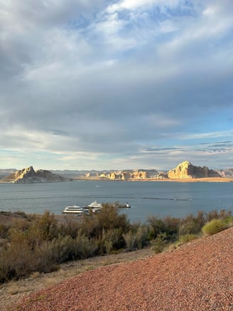 En arrivant à notre hôtel, situé directement sur les rives du lac Powell, nous avons été accueillis par une vue à couper le souffle sur le lac et les montagnes environnantes. 🌊🏔️ Le coucher de soleil sur le lac était un spectacle grandiose, les couleurs changeant du doré au rose, puis au violet alors que le soleil se couchait derrière les collines. C'était le cadre parfait pour se détendre après une journée pleine de rebondissements.